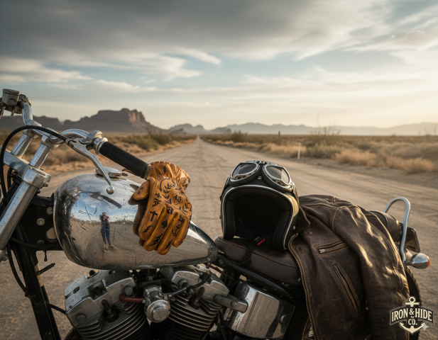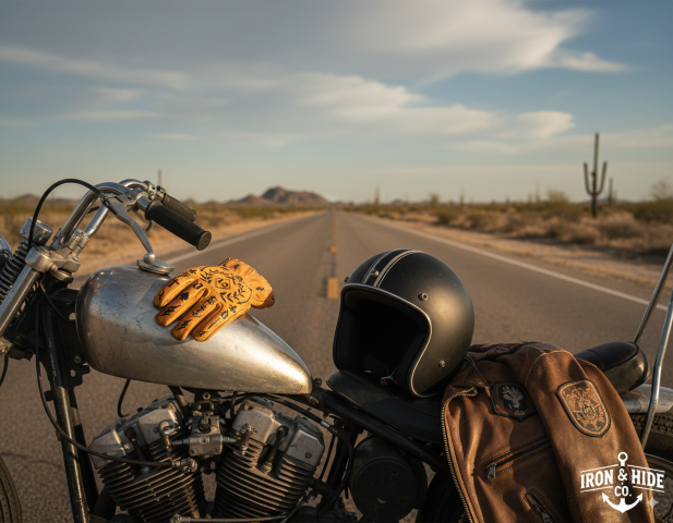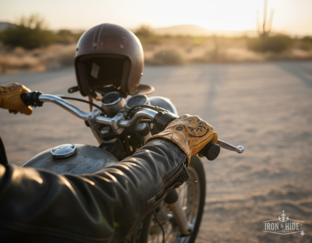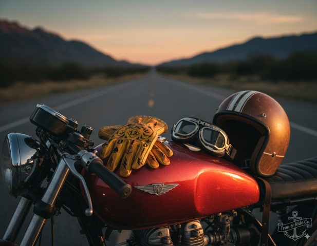 - Old school motorcycle leather gloves with Hold Fast tattoos taking up some codes of the Sailors of the 19th century